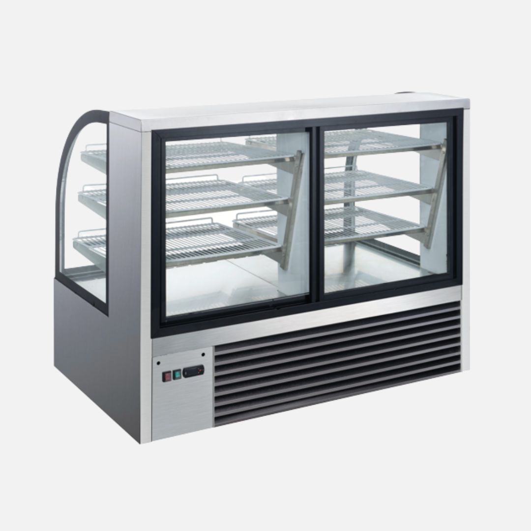 Compact curved-glass bakery display case with LED lighting and ventilated cooling system for countertop use.ty use.